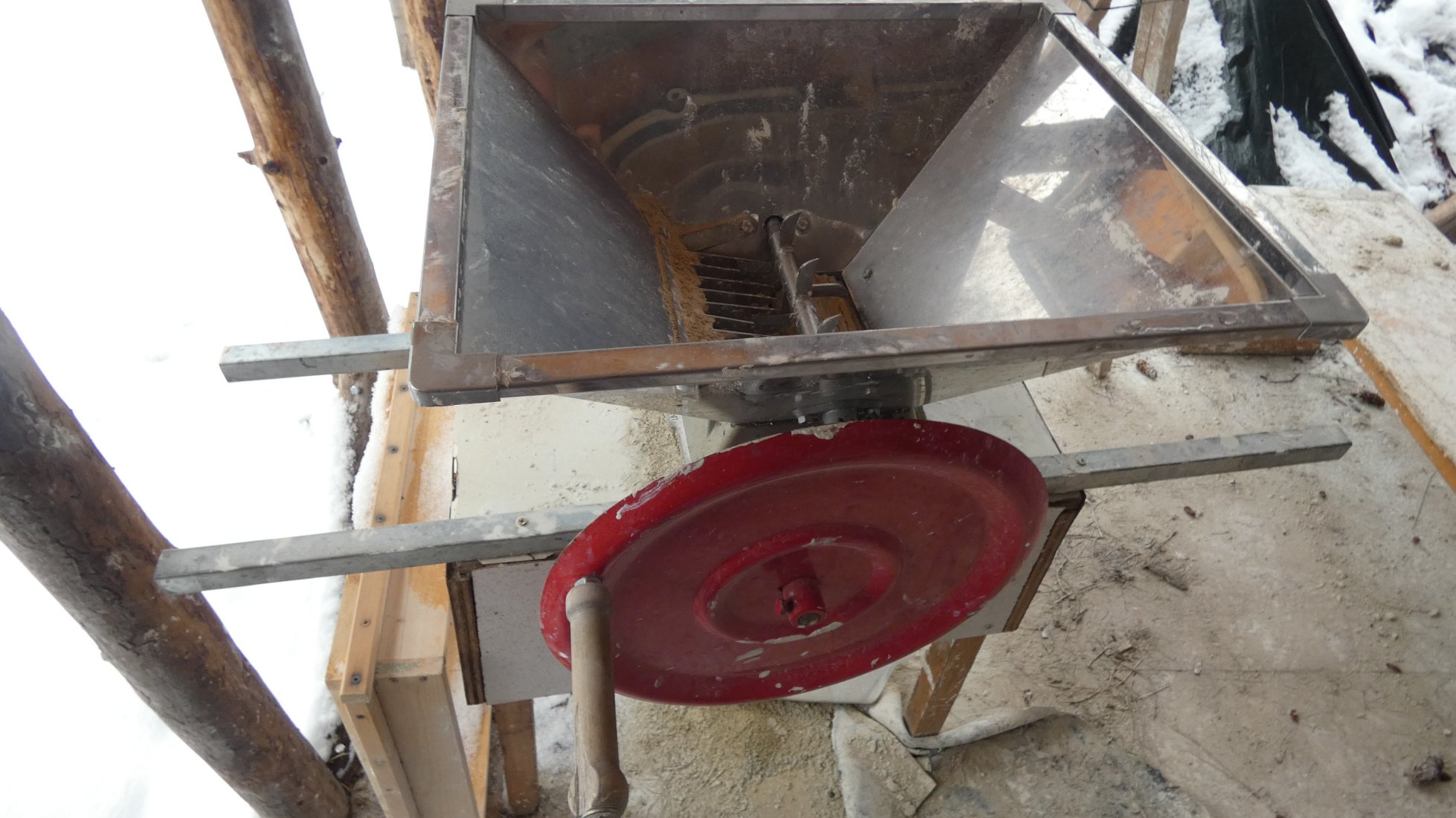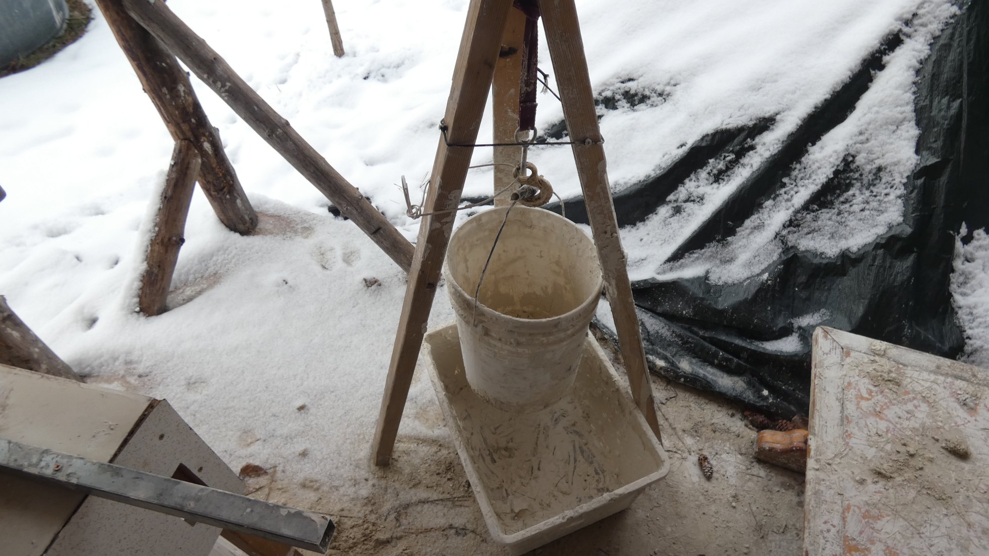 bucket on the tripod. A red plastic paintmixer on a drill is used