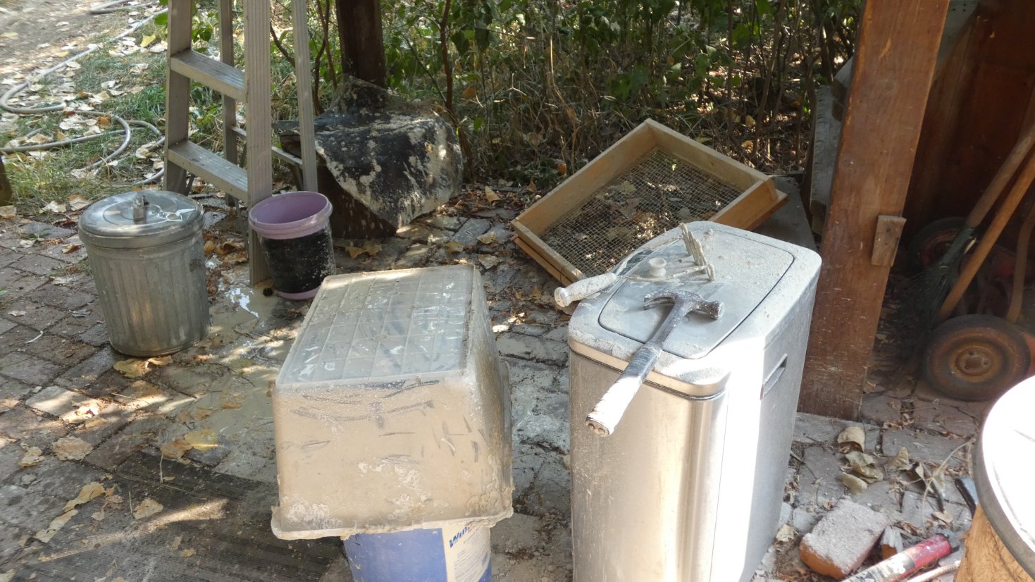 The bin, purple measuring bucket, hammer, and potato masher used to mix the clay