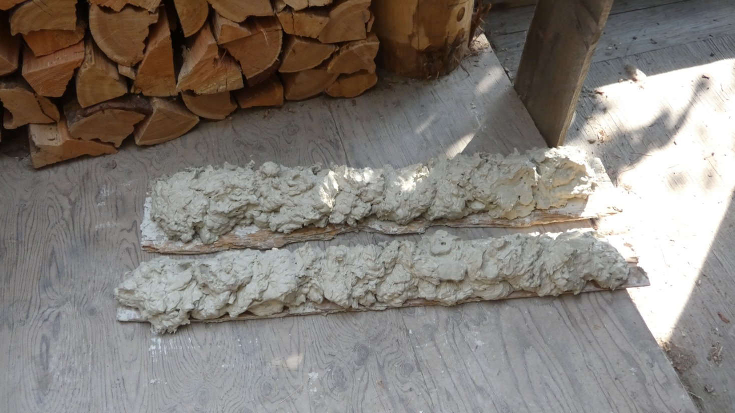 There is about 30 lbs on each board, drying outside until it stiffens enough to go through the pug mill.