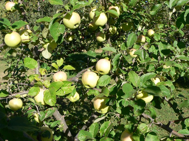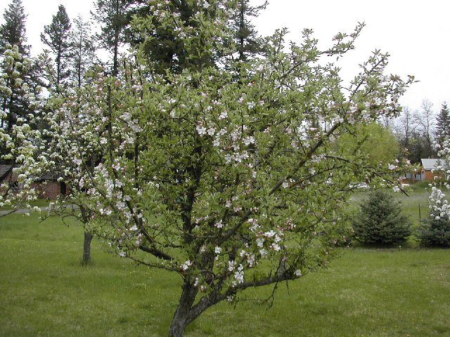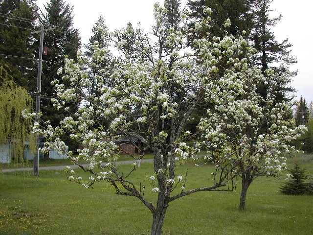 About a year ago we bought a house with a garden and orchard, after walking through the house about once, and never even looking at the orchard. Probably not the best way to buy a place. Anyway, this is one of the two pear trees in March. I tried to prune off branches that grow in towards the middle, or straight up. The bark is scabby, and last year the two large trees only yielded a couple dozen misshapen pears. Doesn't look good....