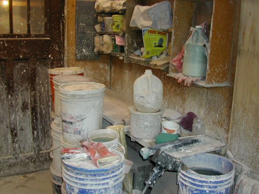 Here you can see the glazing table, narrow and long. It should be wide enough for a ware board, and room to set the pots down in front of the ware board. The right end got extended a while ago, and now is the repository for the glaze stirring drill, pouring cups, and odds and ends. Above the glazing table are the triple beam balance and the small glaze chemical bags. Most of the buckets have glaze in them. The blue bucket on the right is the hand and tool washing bucket. I don't allow running water in my shop, due to probability of drain clogging.