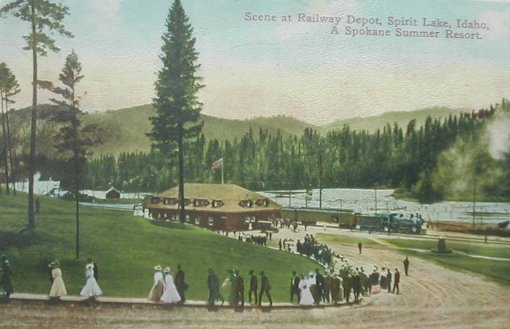 A railway ran from Spokane to Metalline Falls, with a shop and roundhouse in Spirit Lake next to the Panhandle Mill, and passenger service allowed Spokane residents to ride out to Spirit Lake to enjoy the shallow warm waters and pristine wooded views.