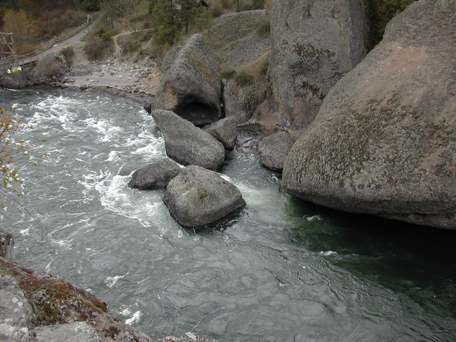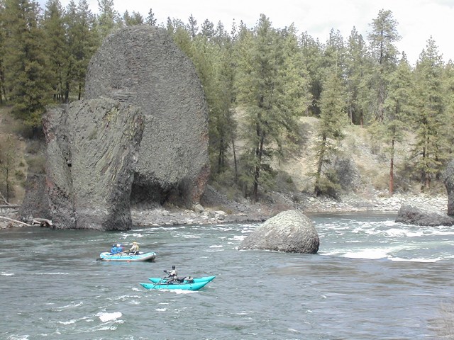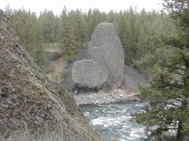 These are basalt rocks, the taller over 50 feet high, along the Spokane River.